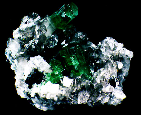 La Dosita- Two Coscuez crystals on classic Coscuez grey calcite. Beautiful multiple terminations. Private collection. Photo by Jeff Scovil ©1992