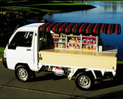 The Refresher White Truck can carry 810 cans, and has 6 cold storage bins.