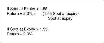 In this structure, premium is invested into a Corridor Option with limits set at 1.52 and 1.62. For each day that the spot stays within the prescribed range, a portion of the pay-out is locked-in; this pay-out is a multiple of the total premium invested. Therefore, if the spot stays within the range for every day of the period, the maximum pay-out will be due, but if the spot never fixes within the range, no pay-out will be due. The actual pay-out is calculated on a pro rata basis for the number of days that spot stays within the prescribed levels. The principal of the deposit is preserved with a minimum pay-out (in this case 1.60%) also assured. The return on investment is defined by the following formula: