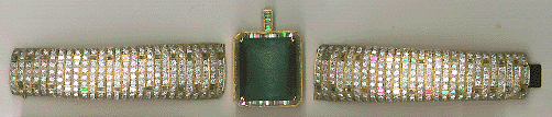Hand Made, Yellow Gold Emerald & Diamond Bracelet18 kt Mounting designed to be worn as a bracelet or as a pendantEmeralds 1 stone, 52.07 ct total Diamonds Square 140 pcs 6.19 ct Diamonds Round 544 pcs 14.22 ct Ref #GE426 $Call per ct |