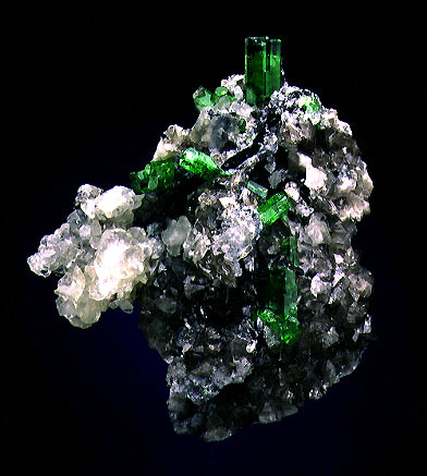 El Jardin-Cabinet size specimen with multiple gemmy clean crystals with perfect terminations on grey calcite from Coscuez. Jim Duncan collection. Photo by Jeff Scovil ©1995