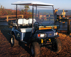 The Clays Cart was designed with the Sporting Clays Shooter in mind. It features a seating for 4, a front storage rack and floor mounted gun racks.